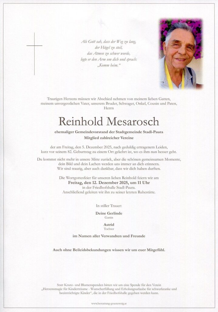 Der Abschied von eurem lieben Reinhold erfüllt euch mit großer Trauer. Obwohl es ihm gesundheitlich nicht gut ging, habt ihr bis zuletzt auf Besserung gehofft. Nun ist er aber doch müde geworden, die Lasten zu tragen und einzuschlafen. Mit ihm verliert ihr einen leidenschaftlichen Familienmensch, der immer für euch da war. Durch sein Engagement im Gemeinderat war er in Stadl-Paura allseits bekannt und wird vielen Menschen in lieber Erinnerung bleiben. Er fehlt euch sehr und der Schmerz sitzt tief, aber die schönen, gemeinsam verbrachten Momente werden ihn lebendig halten. Denn so lange ihr an ihn denkt, so lange ihr von ihm erzählt und über lustige Geschichten von ihm lacht, wird er ein Teil von euch bleiben.