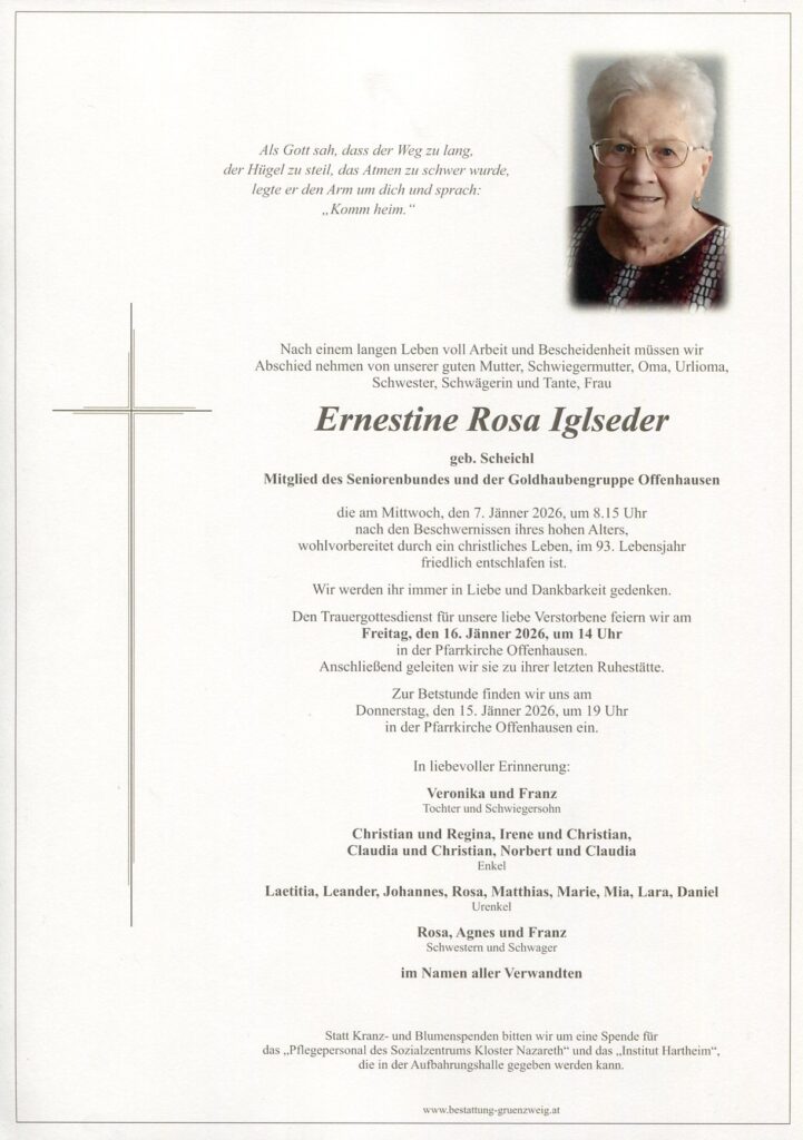 Nach einem langen, erfüllten Leben haben sich die Augen eurer lieben Mama, Schwiegermama, Oma und Urlioma geschlossen. Es tut immer weh, die Mama zu verlieren, die einen das ganze Leben lang prägte und begleitete. Doch die letzte Zeit wurde sehr beschwerlich für sie und nun war es doch eine Erlösung, dass sie einschlafen durfte. Denkt zurück an die unbeschwerten Zeiten, als sie als fleißige Landwirtin am Hof tätig war, denkt an ihr hilfsbereites, freundliches und sympathisches Wesen, an die schönen Stunden, die ihr mit ihr verbracht habt und an all die Zeichen ihrer Liebenswürdigkeit. Wenn ihr all das nicht vergesst, wird sie immer einen Platz in euren Herzen haben und sie wird nun als Schutzengel über euch wachen.