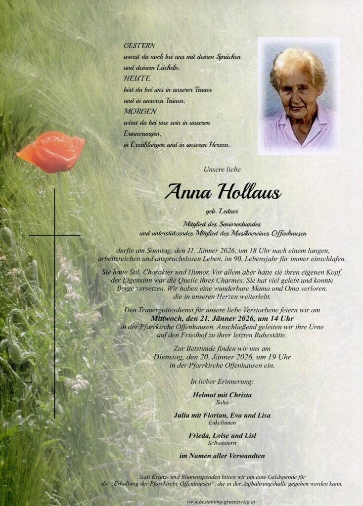obwohl es eurer lieben Mama und Oma gesundheitlich die letzten Wochen nicht mehr gut ging, kam ihr Abschied überraschend schnell. Sie war all die Jahre der Mittelpunkt eurer Familie und stand euch stets mit Rat und Tat zur Seite. Nun blickt ihr zurück auf all die schönen gemeinsamen Jahre und viele Erinnerungen werden wach. Denkt an ihr liebevolles und temperamentvolles Wesen, an ihre offenen, geradlinigen Worte, erzählt von ihr und lacht über lustige Geschichten, die ihr gemeinsam mit ihr erlebt habt. Auf diese Weise wird sie euch immer nahe sein.