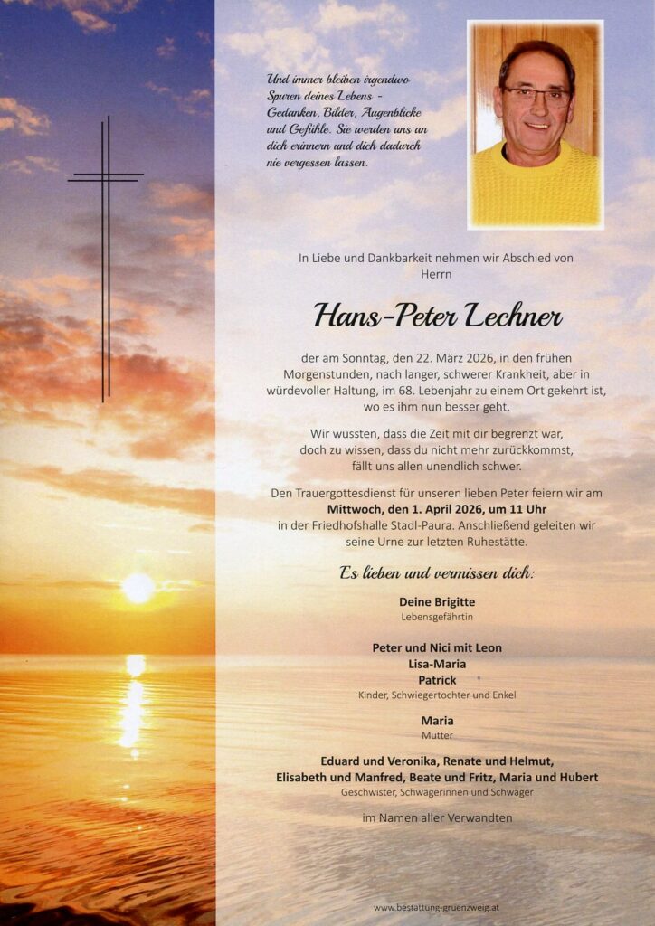 Lieber Peter, danke, dass du für uns da warst, wir wünschen dir, dass du befreit bist von Krankheit und Schmerzen und du nun in Licht und Liebe geborgen bist.