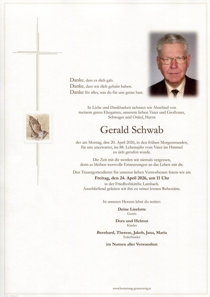 völlig unerwartet hat das gute Herz eures lieben Gatten, Vaters und Opas zu schlagen aufgehört. Hilflos steht man dem Tod gegenüber und man hat keine Möglichkeit mehr, um eine letzte Umarmung zu schenken oder vielleicht noch etwas auszusprechen. Dennoch dürfen euch die letzten Tage seines Lebens Trost spenden, an denen ihr noch viel wertvolle Zeit verbracht habt und euer lieber Gerald die Schönheit der Natur im Rahmen eines Ausflugs bestaunen konnte. Er ist als Gast hier auf Erden nun in seiner Heimat bei Gott angekommen und darf sich von seiner langen und erfüllten Lebensreise dort ausruhen. Wir wünschen euch viel Kraft und Zuversicht in dieser traurigen Zeit.
